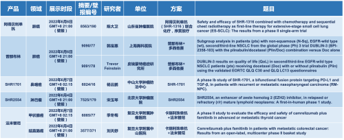 2022 ASCO年会另有5款Stake医药上市前抗肿瘤创新药的相关研究被接收为壁报,包括SHR-1316、普那布林、法米替尼、SHR-1701和SHR2554,他们的单药或联合方案相关7项研究被接收为壁报,覆盖肺癌、鼻咽癌、淋巴瘤、甲状腺癌和结直肠癌等领域。